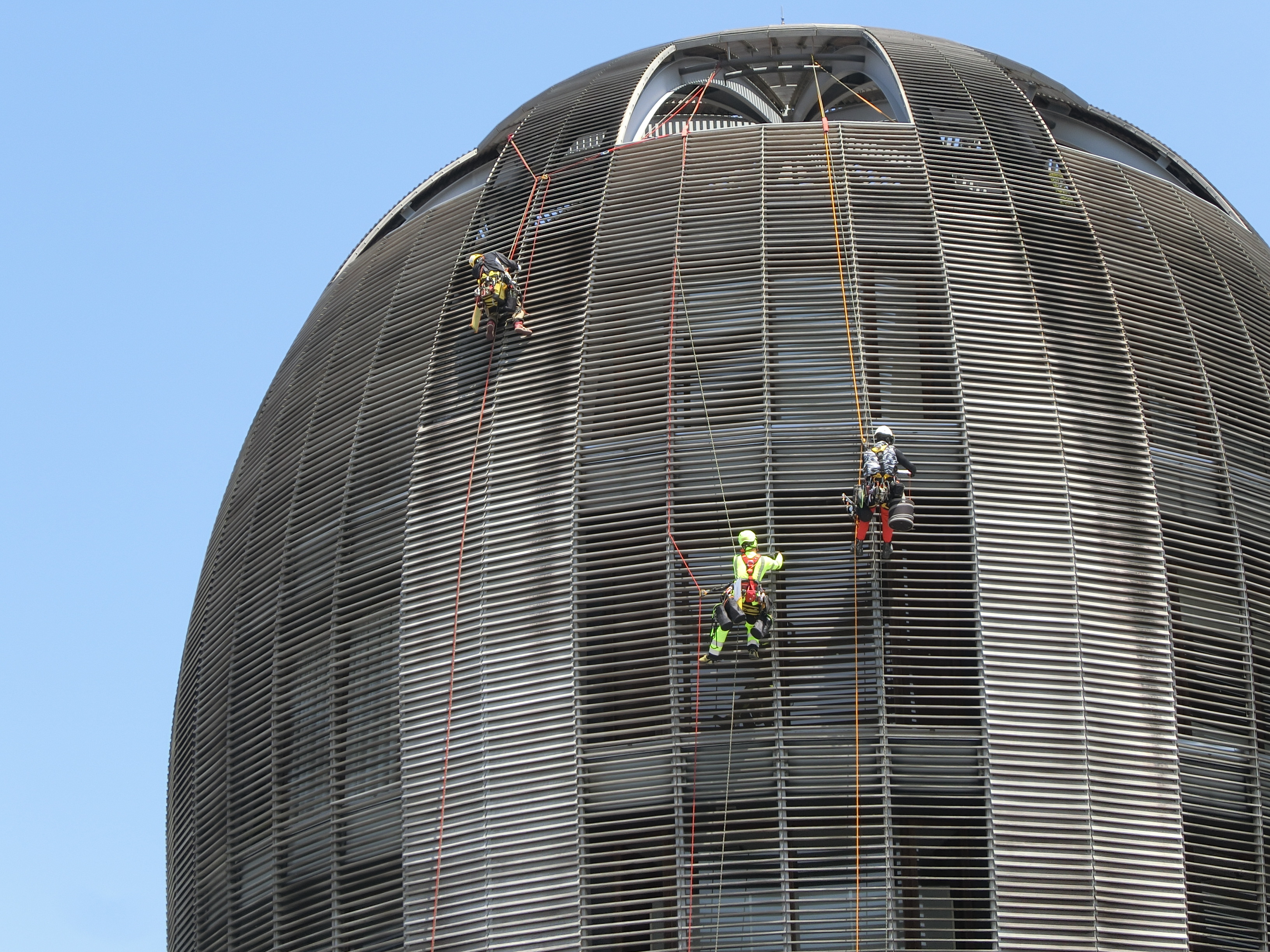 また、ビルに挟まれた狭い空間やとても複雑な構造体などでもアクセス可能な作業手段であり、従来のブランコなどに比べはるかに高度の安全性と作業性の概念を有する作業手段です。